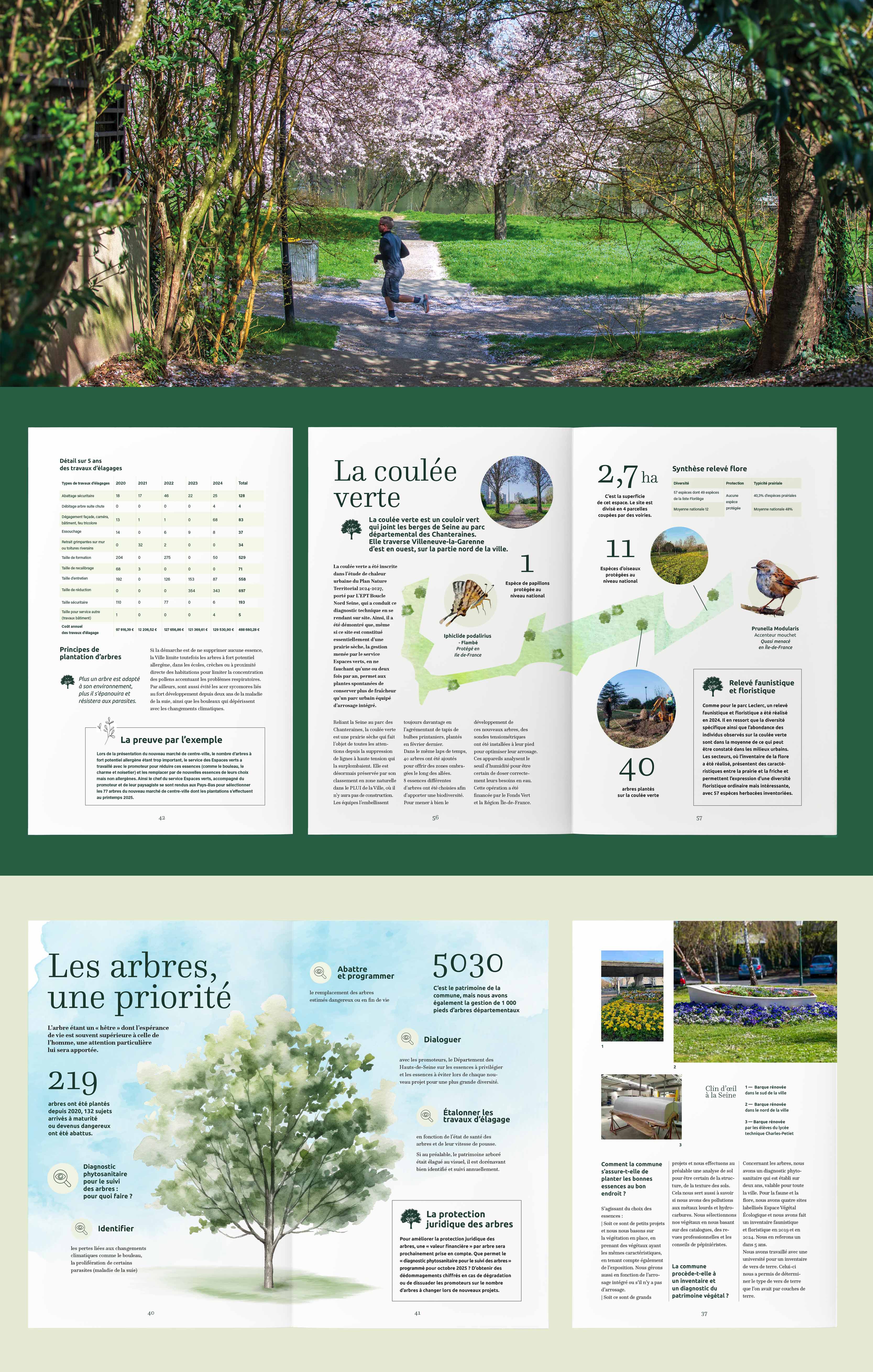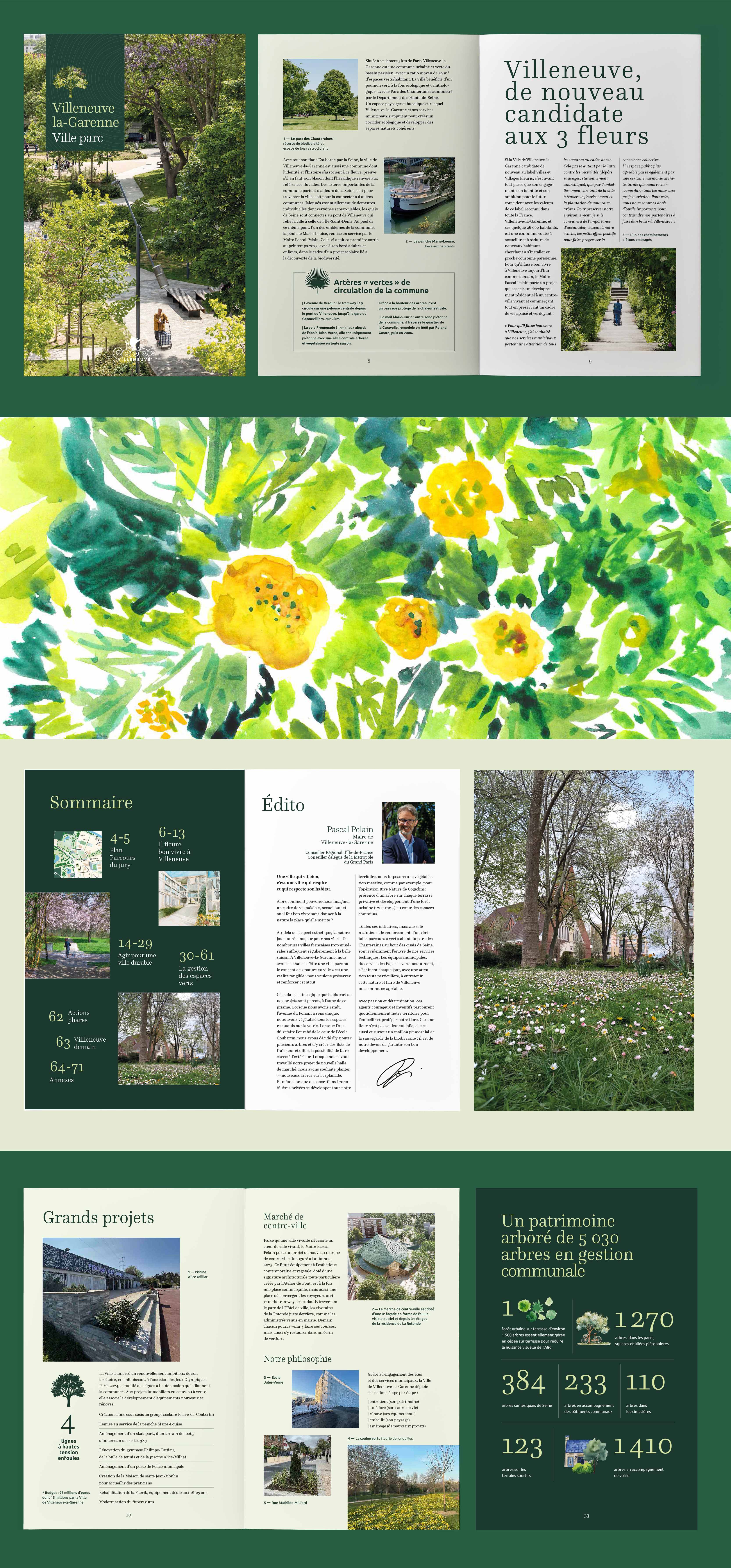 Conception de la brochure de présentation du territoire végétalisé de la ville de Villeneuve-la-Garenne, dans le cadre du dossier de candidature 2025 au label "Villes et Villages Fleuris". L’identité graphique met en lumière l’engagement écologique de la ville tout en respectant les critères esthétiques et techniques du label. Illustrations de Paule Canonici